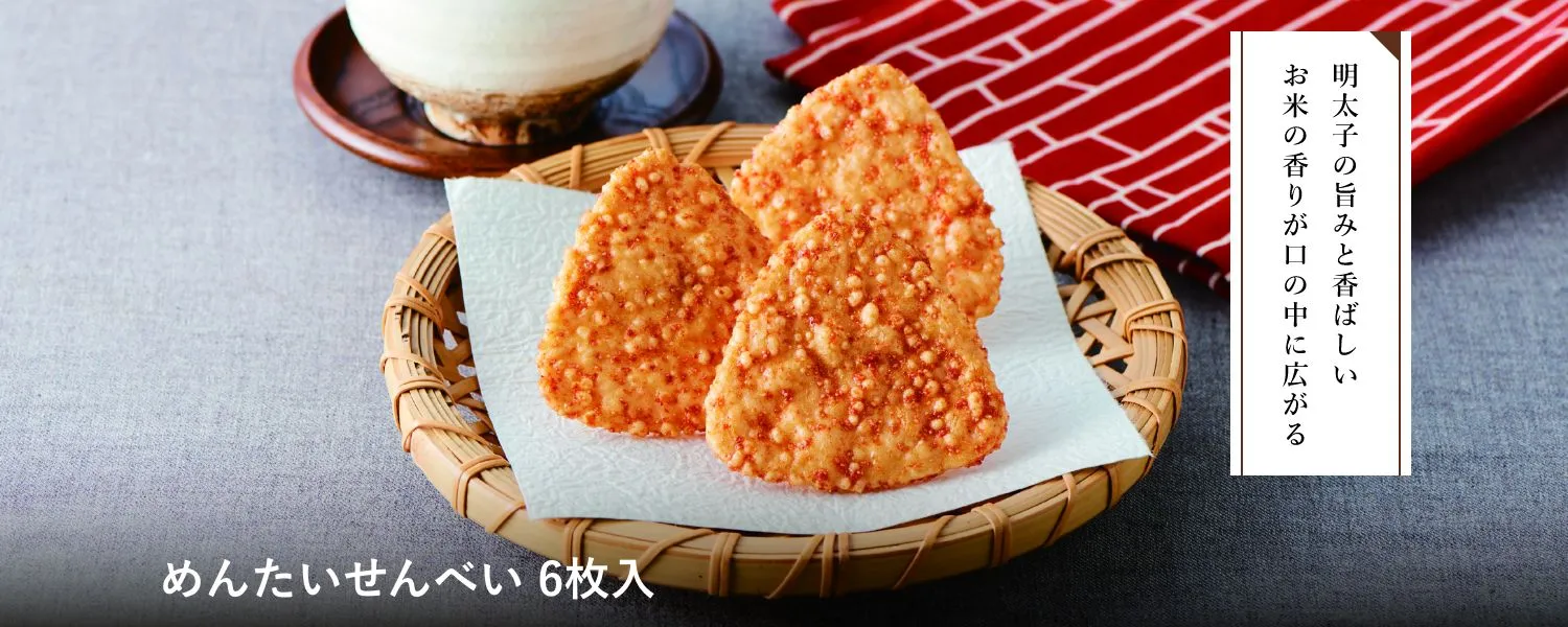 国産うるち米の粒の素材感が残るせんべいに、明太子の旨みたっぷりの旨辛たれ「めんたい辛みソース」を絡ませました。 パリッと香ばしく上品な食感の中に、明太子の旨辛さが広がります。